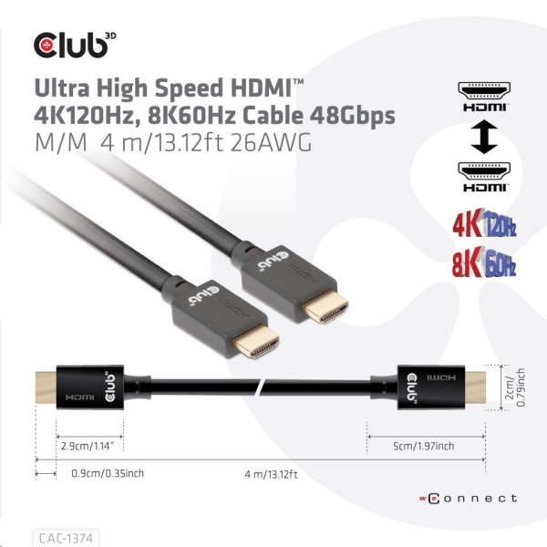 Club3D Kabel Ultra Rychlý HDMI™, 4K120Hz, 8K60Hz Cable 48Gbps (M/M), 28AWG, 4m