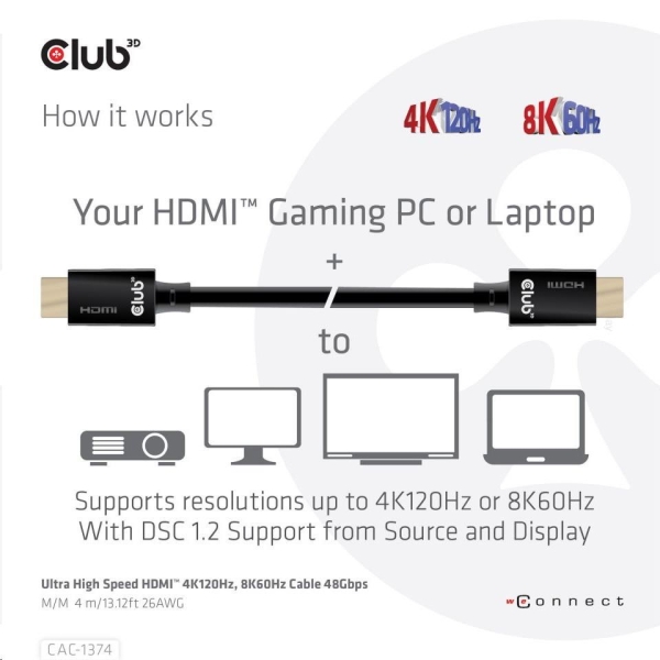Club 3D CAC-1374 Ultra High Speed HDMI™2.1 Kábel je skonštruovaný tak, aby zvládol najvyššiu kvalitu video- a audio- signálov.
