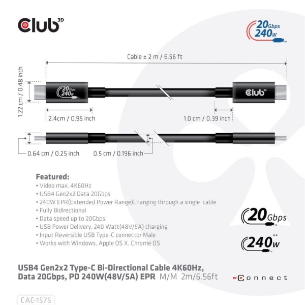 Club 3D CAC-1575 USB4 Gen2x2 Type-C obojsmerný kábel, video do 4K60Hz, dáta 20Gbps, PD 240W(48V/5A) EPR, rozšírený rozsah napájania M/M 2m/6.56ft pripojí váš notebook, tablet alebo telefón s výstupom USB4 typu C k vašim obľúbeným existujúcim periférnym zariadeniam, príslušenstvu a nabíjačkám. Umožňuje prenos videa, dát a napájania cez jeden kábel a oboma smermi. Tento kábel podporuje prenos dát cez USB4 Gen2x2 až do rýchlosti 20 Gb/s, video s frekvenciou až 4K60 Hz a výstup EPR (Extended Power Range) s výkonom až 240 W (48 V/5A) na nabíjanie alebo napájanie notebooku, tabletu alebo smartfónu.