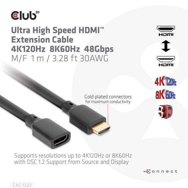 The Club 3D CAC-1322 Ultra High Speed HDMI™2.1 Extension Cable is built to handle the highest quality video- and audio- signals. HDMI™2.1 Increased Bandwidth to 48Gbps.The increase in maximum bandwidth compared to previous versions is achieved by increasing both the bitrate of the data channels (from 6Gbps to 12Gbps) and the number of channels (from 3 to 4). This allows support for resolutions up to supports 4K120Hz or 8K60Hz! New feature included in this Specification is Display Stream Compression (DSC) 1.2, this is used for video formats higher than 8K with 4:2:0.