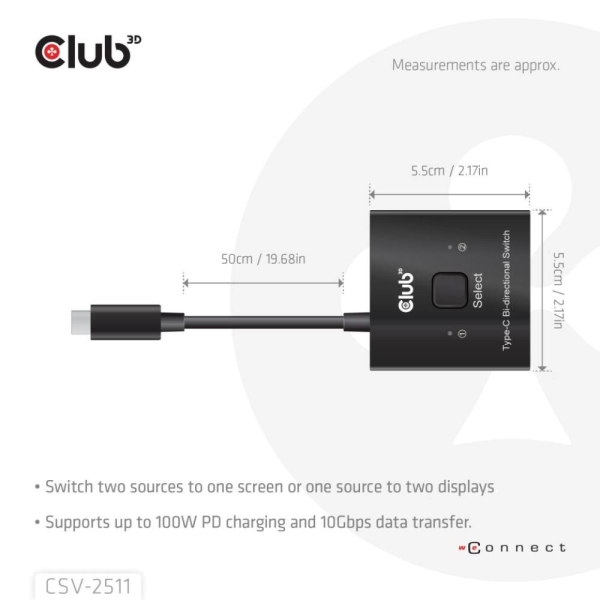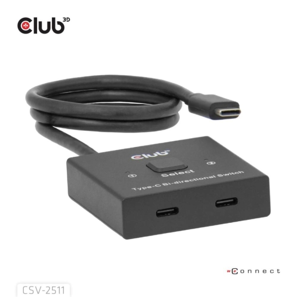 Plnohodnotný obousměrný přepínač Club 3D CSV-2511 může přepínat dva zdroje na jeden displej nebo jeden zdroj na jeden ze dvou displejů. Tento přepínač podporuje více rozlišení a až 8K nebo přenos dat max. 10 Gb/s nebo nabíjení PD3.0 max. 100 W PD. Může pracovat na všech hostitelských zařízeních USB-C, kompatibilních se zařízeními Thunderbolt.