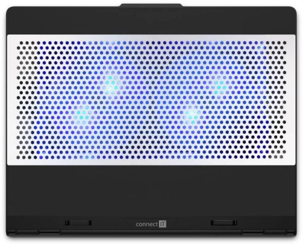 Chladicí podložka pod notebook CONNECT IT "FrostCool" CCP-7100-BK, která je vybavená dvěma ventilátory s modrým LED podsvícením, hliníkovou chladící mřížkou a výškovým šestistupňovým polohováním. Kompatibilní s notebooky do 15,6".
