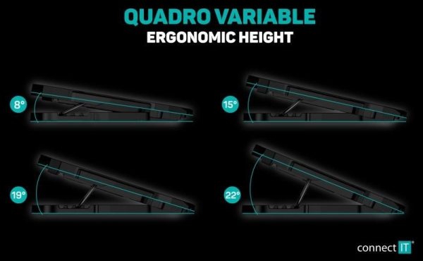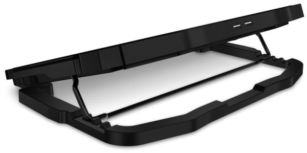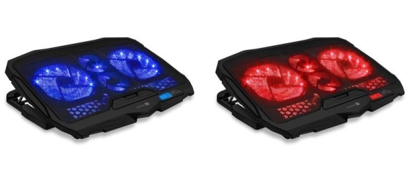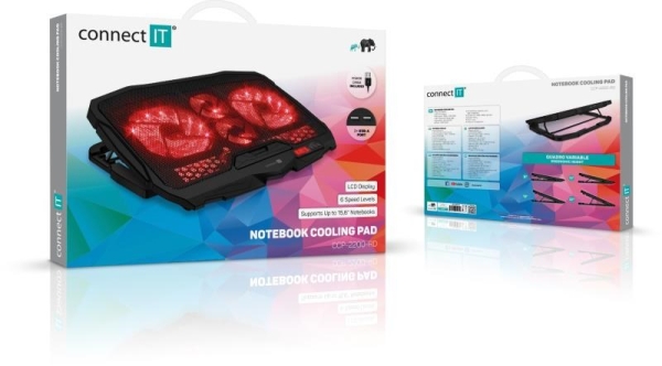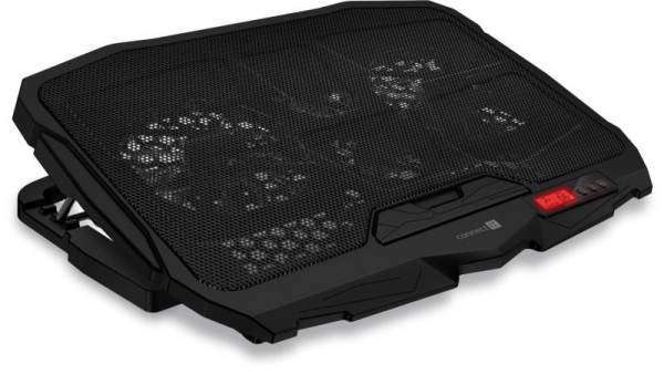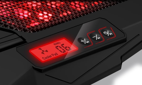 Chladicí podložka pod notebook se čtyřmi šestirychlostními ventilátory, digitálním displejem, výškovým polohováním ve 4 úrovních a dvěma USB porty. Podložka zajišťuje jak odvod tepla z notebooku a jeho ventilačních otvorů, tak i přímé ochlazování pláště notebooku díky cirkulaci chladného vzduchu a celkově tak zvyšuje výkon notebooku. Je plně kompatibilní s notebooky až do velikosti 15,6" a díky kompaktním rozměrům je předurčena jak pro práci doma a v kanceláři, tak i pro cestování a časté přenášení. Ultratichý chod 4 ventilátorů vás nebude rušit ani při nejnáročnější práci vyžadující maximální soustředění. Výšková polohovatelnost ve 4 různých stupních vám zajišťuje maximální pohodlí i při delších pracovních či herních sezeních.