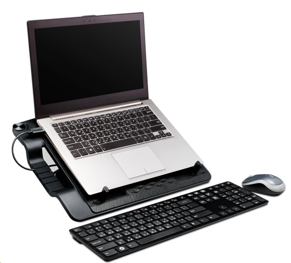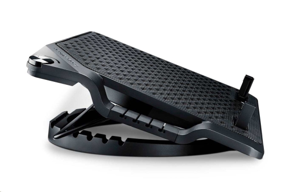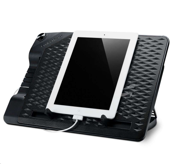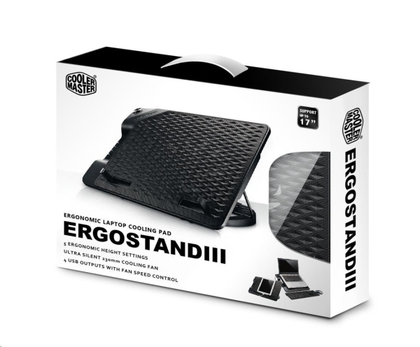 CoolerMaster polohovatelný chladící podstavec pod notebooky NotePal ErgoStand III je napájený přímo z notebooku přes USB rozhraní. Je zcela mobilní a neboť nezabírá příliš mnoho prostoru, je vhodný i na cestování. Majitelé výkonných notebooků tak mohou šetřit své přístroje i při hraní na cestách. VARIABILNÍ NASTAVENÍ POLOHY Podstavec díky integrovanému stojánku disponuje možností nastavení polohy. Správným nastavením získáte možnost dlouhodobější práce nebo hraní na notebooku bez přivození potíží zad a zápěstí. POHODLNÉ A RYCHLÉ UCHYCENÍ PŘÍSTROJE Na spodní straně se nacházejí praktické protiskluzové držáky, které udržují notebook ve stabilní poloze i při nastavení vysokého úhlu sklonu. KVALITNÍ CHLAZENÍ Tělo podstavce (chladiče) je vyrobeno z kombinace materiálu Metal Mesh a plastu, podložka je děrovaného designu a tak velmi dobře rozvádí vzduch na celou plochu chladiče a zajišťuje tak kvalitní odvod tepla do okolí. Pokud by nestačilo klasické chlazení notebooku pouze pasivní podložkou, je zařízení vybaveno ventilátorem o průměru 230 mm, který má rychlost 500-800 otáček za minutu, průtokem vzduchu 72CFM a hlučností max. 21dBA. Podložka je určena pro notebooky s úhlopříčkou displeje až 17'' ale i klasické kompaktní zařízení jakými jsou například tablety. VLASTNOSTI: - Celkové rozměry podložky jsou 385 x 280 mm. - Proměnná výška v závislosti na nastavení pohybuje v rozmezí 46.7 – 225.5 mm. - Hmotnost je pouze 1.21 kg - 4x USB, 1x microUSB a 1x miniUSB. SPECIFIKACE: Vyhrazená velikost: do 17 '' Rychlost otáčení: 500 - 800 ot / min Proud vzduchu: 72 - 72 CFM Počet instalovaných ventilátorů: 1 Instalované ventilátory: 1x230 mm Nastavitelný úhel náklonu: 6 úrovní Podsvícení: Ne Konstrukce: Integrovaný rozbočovač USB Typ ložiska: LDB Materiál: Plast, Kov Zdroj napájení: USB (5V) Úroveň hluku: 21 dB Barva: Černá Délka: 46,7 mm Šířka: 385 mm Výška: 280 mm Hmotnost: 1210 g