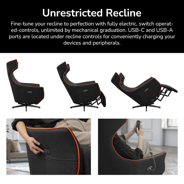 USB-A a USB-C porty pro nabíjení zařízení přímo na křesle.