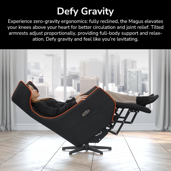 Rise to Power – Zažijte pocit beztíže! MAGUS není obyčejné herní křeslo, ale elektrický recliner nové generace, který vám poskytne maximální komfort, ergonomii a styl. Díky plně elektrickému systému sklápění a nulové gravitaci se budete cítit, jako byste levitovali.