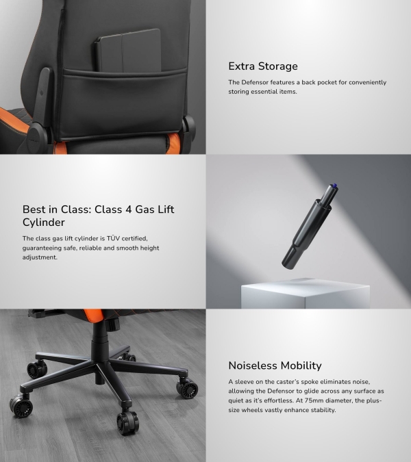 Equipped with a Magnetic Memory Foam Neck Pillow, the Defensor lets you easily position the pillow to your exact preference. The memory foam conforms to your body's shape, relieving pressure on your neck and making sure you stay healthy through those long gaming sessions.
