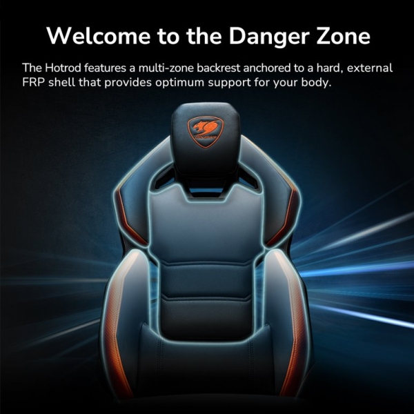 Design herního křesla Hotrod Royal obepíná tělo a obsahuje vícezónové opěradlo ukotvené k tvrdé vnější FRP skořepině,