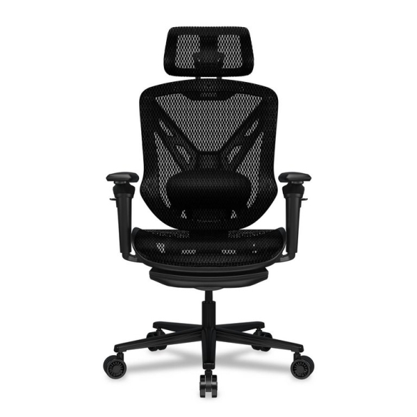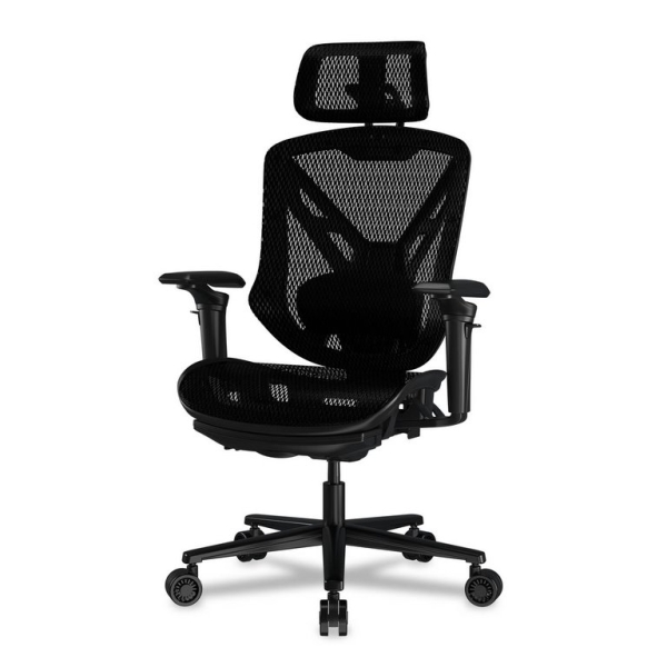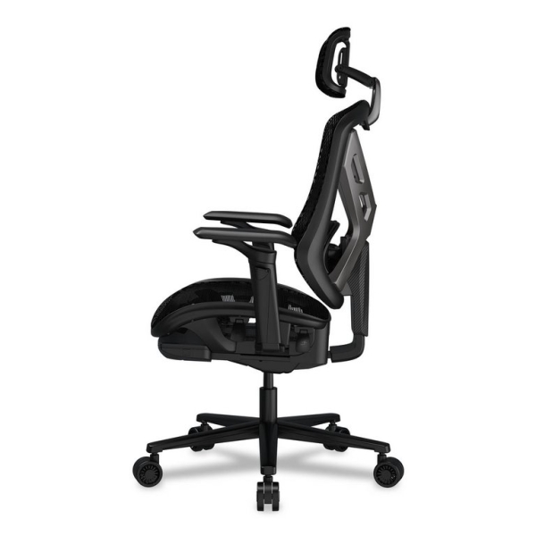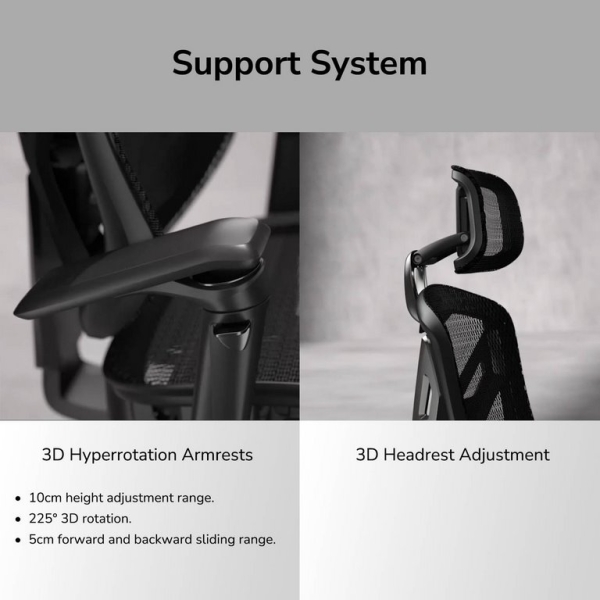 3D Hyperrotation armrests provide a wide range of motion, supporting various arm positions, while the headrest adjusts for personalized comfort.