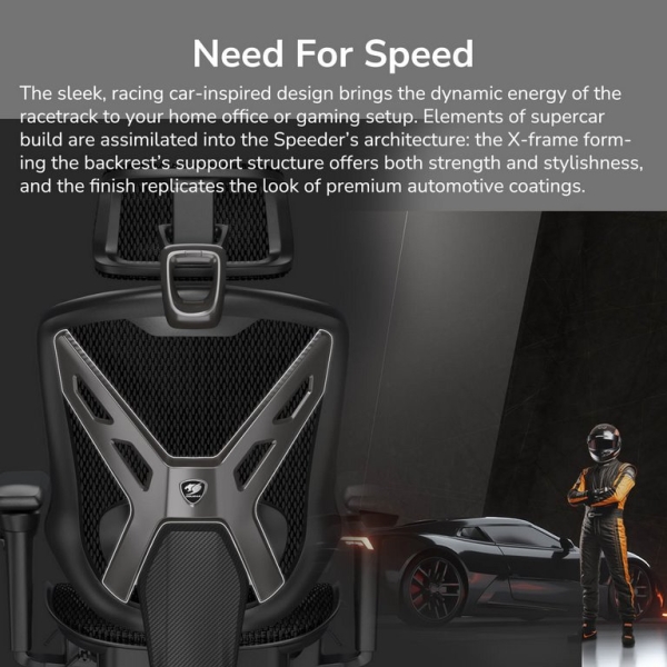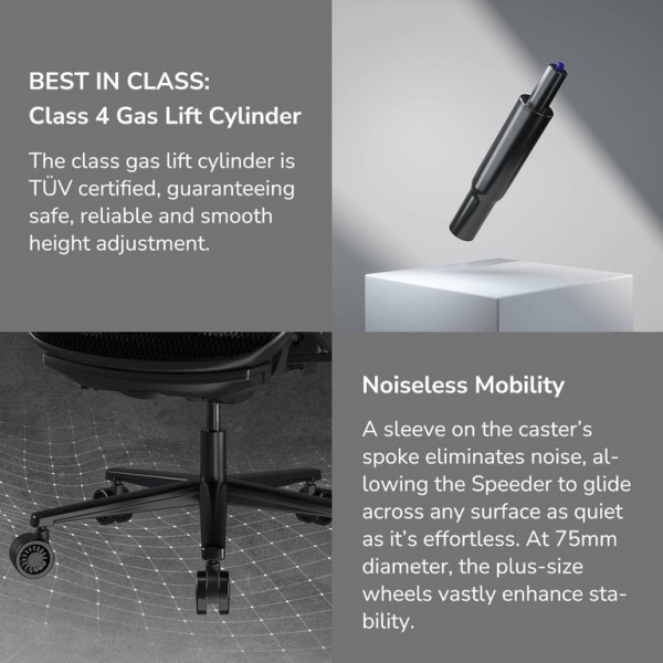 Gaming and work areas often overlap in modern living spaces: the Speeder is designed with this versatility in mind. Inspired by the world of racing, its sleek frame rolls the aesthetic flair of a performance car chassis into the room, and its ergonomic features help you maintain a healthy posture whether you’re racing against the clock at crunch time or seizing that in-game clutch moment. Chenille Yarn mesh provides tactile comfort, while precisely tunable backrest height, lumbar and seat depth ensure a perfect fit. 3D Hyperrotation armrests rotate within a 225° range, allowing multiple positions whether you’re on mobile, console or reclining. The Speeder supports your body to keep your hands and mind agile, so when it comes down to the wire, you can work fast…and play hard.