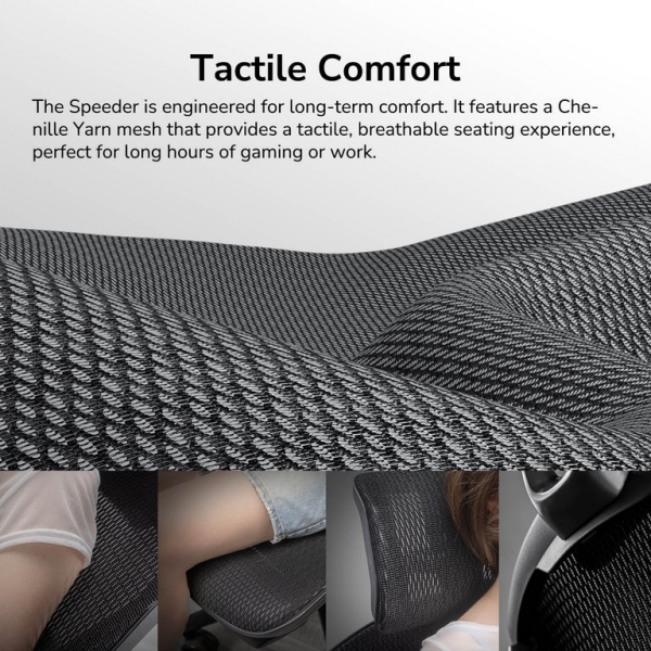The Speeder is engineered for long-term comfort. It features a Chenille Yarn mesh that provides a tactile, breathable seating experience, perfect for long hours of gaming or work.