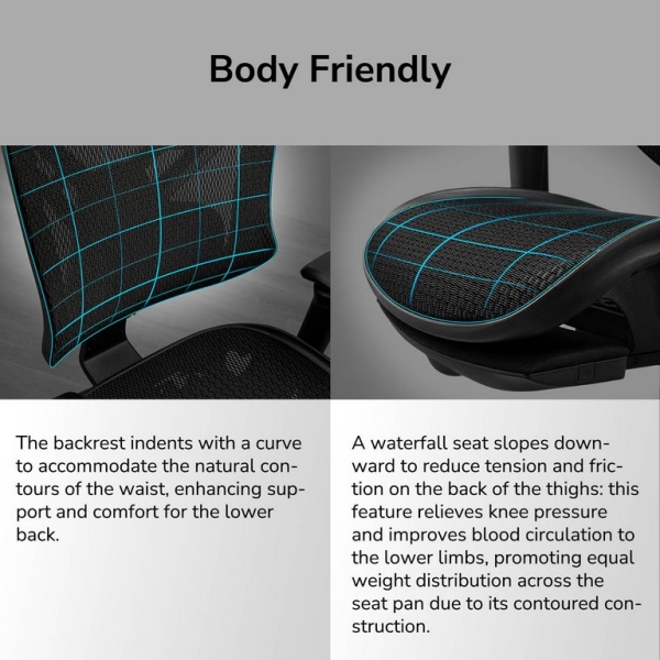 The backrest indents with a curve to accommodate the natural contours of the waist, enhancing support and comfort for the lower back. A waterfall seat slopes downward to reduce tension and friction on the back of the thighs: this feature relieves knee pressure and improves blood circulation to the lower limbs, promoting equal weight distribution across the seat pan due to its contoured construction.