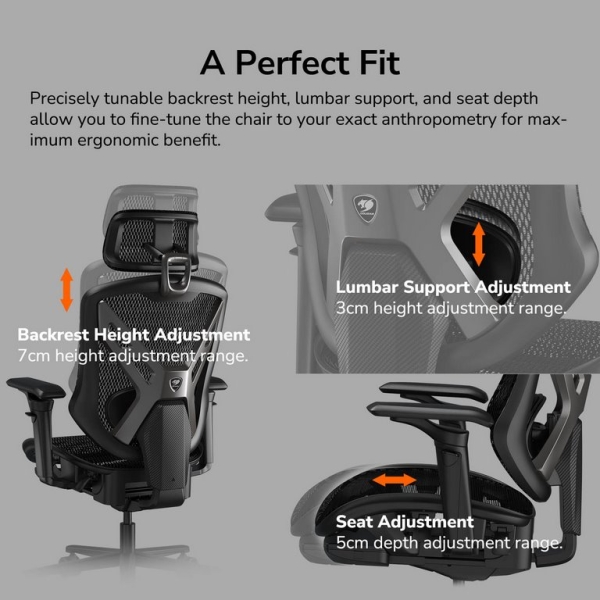 - Precisely tunable backrest height, lumbar support, and seat depth.