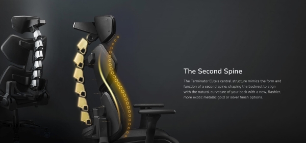 The Terminator Elite’s central structure mimics the form and function of a second spine, shaping the backrest to align with the natural curvature of your back with a new, flashier, more exotic metallic gold or silver finish options.