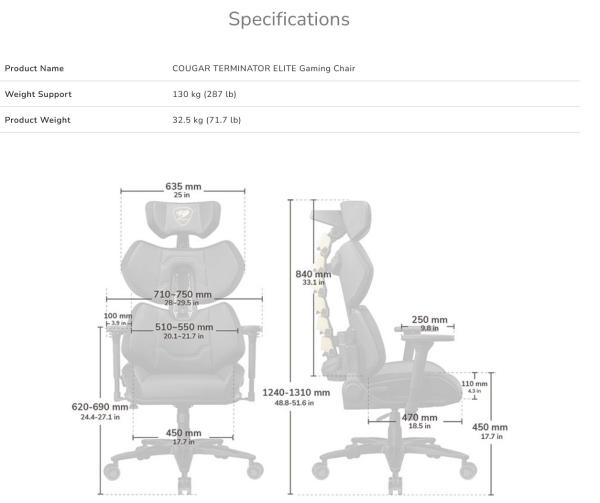 Everything starts from the foundation: with a model-exclusive extra large 29.6” aluminum wheelbase and 3” casters guaranteeing stability, the Terminator Elite makes sure you stay firmly rooted and anchored throughout your game.