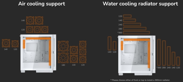 * Pro instalaci 360mm chladiče si vyberte přední nebo horní část.