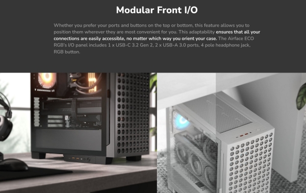 Ať už dáváte přednost portům a tlačítkům na horní nebo spodní straně, tato funkce vám umožní umístit je tam, kde vám to nejvíce vyhovuje. Tato přizpůsobivost zajišťuje, že všechna vaše připojení jsou snadno přístupná bez ohledu na to, jakým způsobem skříň orientujete. Vstupně-výstupní panel Airface ECO RGB obsahuje 1 x port USB-C 3.2 Gen 2, 2 x port USB-A 3.0, 4pólový konektor pro sluchátka a tlačítko RGB.