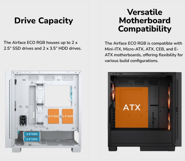 Airface ECO RGB je kompatibilní se základními deskami Mini-ITX, Micro-ATX, ATX, CEB a E-ATX a nabízí tak flexibilitu pro různé konfigurace sestav.