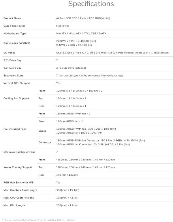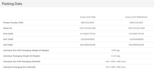 Airface ECO RGB pojme GPU o maximální délce 390 mm, který lze nastavit jak horizontálně, tak vertikálně. V reakci na zpětnou vazbu uživatelů byl u Airface ECO RGB vylepšen vertikální prostor pro GPU toto vylepšení poskytuje více prostoru pro nerušené proudění vzduchu kolem GPU.