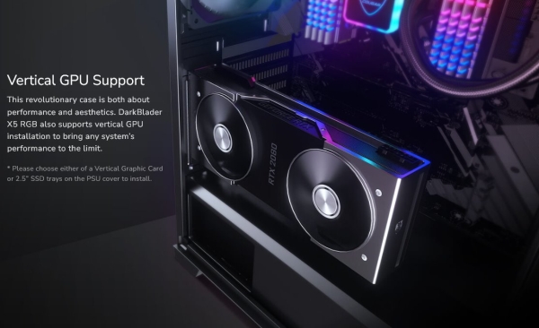 This revolutionary case is both about performance and aesthetics. DarkBlader X5 RGB also supports vertical GPU installation to bring any system’s performance to the limit.