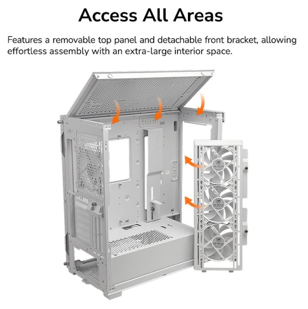 Odnímatelný horní panel a odnímatelná přední konstrukce nabízejí neomezený přístup do vnitřního prostoru a poskytují vám mimořádně velký prostor, díky němuž je sestavení vaší sestavy nejjednodušší, jaké kdy bylo.