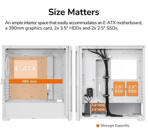 Díky 240mm širokému tělu nabízí Duoface Pro RGB dostatek vnitřního prostoru, který snadno pojme základní desku formátu E-ATX, 390mm grafickou kartu a dva 3,5? pevné disky a dva 2,5? SSD, takže je ideální i pro ty nejnáročnější systémové sestavy.