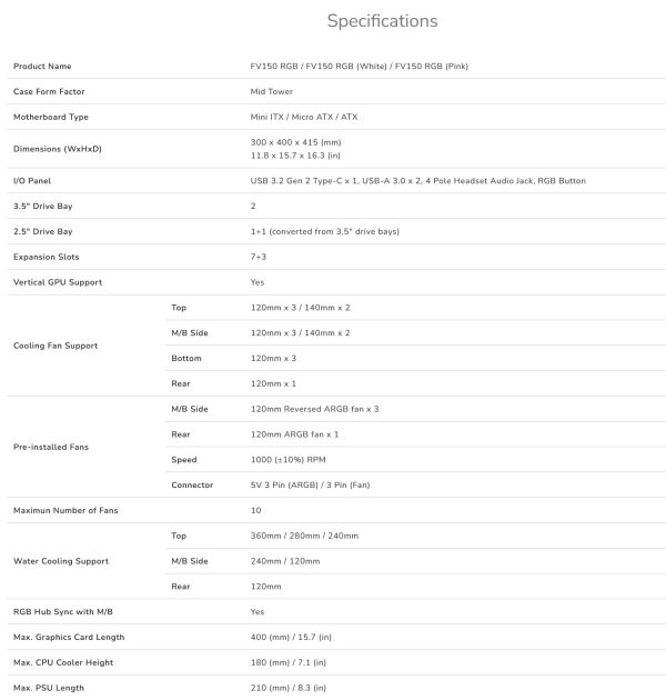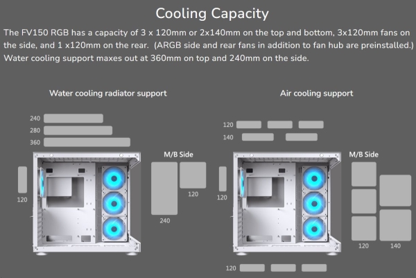 The FV150 RGB has a capacity of 3 x 120mm or 2x140mm on the top and bottom, 3x120mm fans on the side, and 1 x120mm on the rear. (ARGB side and rear fans in addition to fan hub are preinstalled.) Water cooling support maxes out at 360mm on top and 240mm on the side.