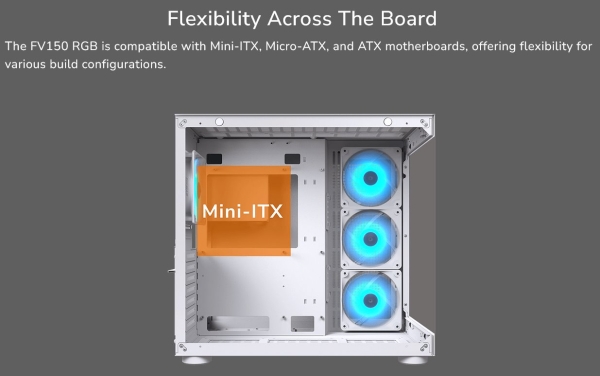 The FV150 RGB is compatible with Mini-ITX, Micro-ATX, and ATX motherboards, offering flexibility for various build configurations.