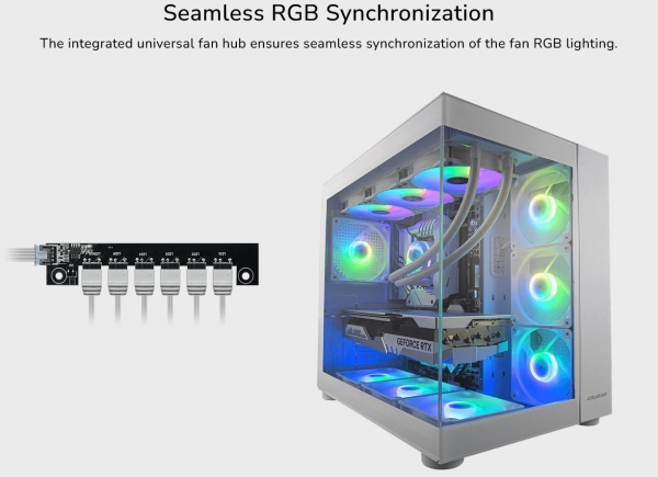 The integrated universal fan hub ensures seamless synchronization of the fan RGB lighting.