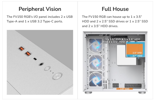 The FV150 RGB can house up to 1 x 3.5” HDD and 2 x 2.5” SSD drives or 1 x 2.5” SSD and 2 x 3.5” HDD drives.