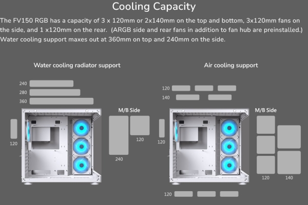 The FV150 RGB has a capacity of 3 x 120mm or 2x140mm on the top and bottom, 3x120mm fans on the side, and 1 x120mm on the rear. (ARGB side and rear fans in addition to fan hub are preinstalled.) Water cooling support maxes out at 360mm on top and 240mm on the side.