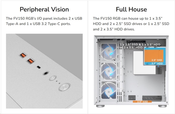 The FV150 RGB can house up to 1 x 3.5” HDD and 2 x 2.5” SSD drives or 1 x 2.5” SSD and 2 x 3.5” HDD drives.