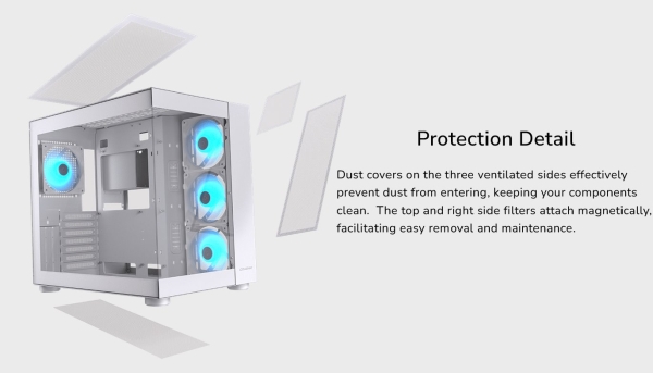Dust covers on the three ventilated sides effectively prevent dust from entering, keeping your components clean. The top and right side filters attach magnetically, facilitating easy removal and maintenance.