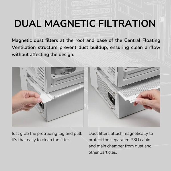 Magnetické prachové filtry na střeše a základně centrální plovoucí ventilační struktury proaktivně zabraňují hromadění prachu a nečistot, udržují čistý a nepřerušovaný proud vzduchu, aniž by narušovaly zavěšený design.