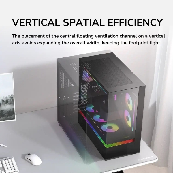 Ventilátory COUGAR Unity ARGB 240 s jedním rámem a reverzními lopatkami PWM jsou předinstalovány na straně základní desky a poskytují přesné řízení rychlosti ventilátoru, výjimečné chlazení, téměř bezhlučný provoz a ohromující RGB osvětlení ihned po vybalení.