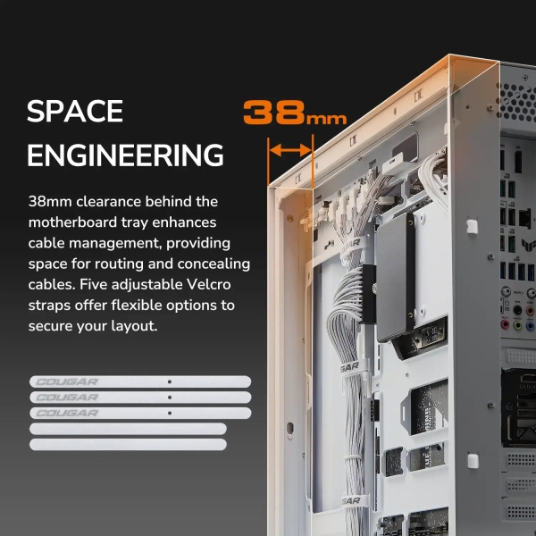 38 mm volného prostoru za přihrádkou pro základní desku zlepšuje správu kabelů a nabízí více místa pro vedení a skrytí kabelů různé tloušťky.