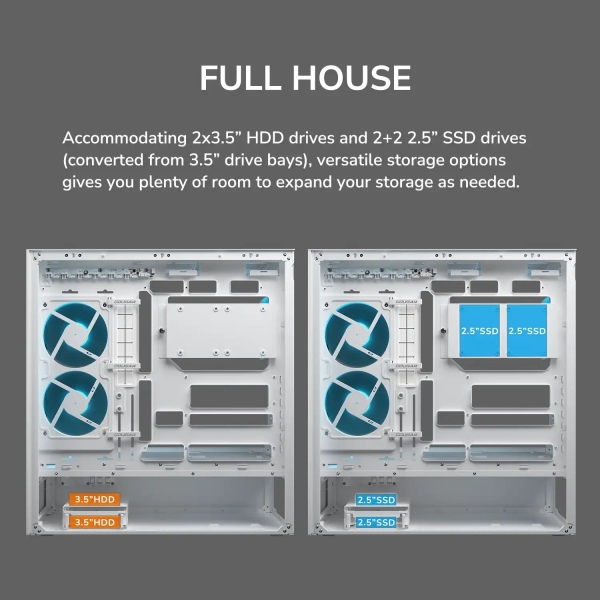 Díky prostoru pro 2x3,5" HDD disky a 2+2 2,5" SSD disky (převedené z 3,5" pozic pro disky) vám univerzální možnosti úložiště poskytují dostatek prostoru pro rozšíření úložiště podle potřeby.