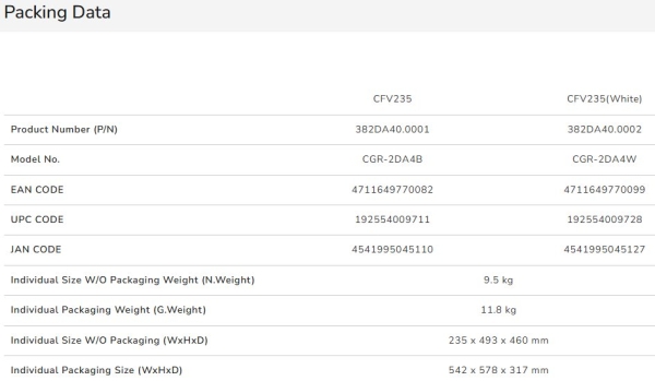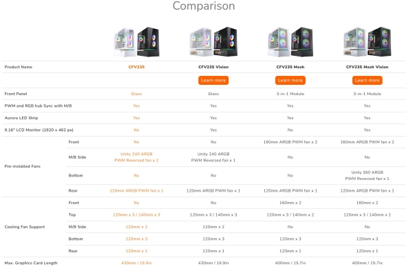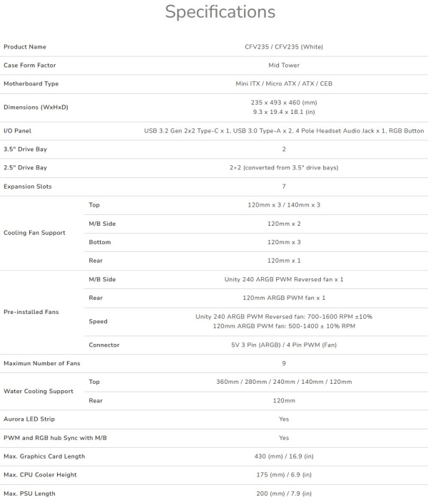 CFV235 má ventilátorovou kapacitu 3x120 mm nebo 3x140 mm na horní straně, 3x120 mm na dně hlavní komory, 2x120 mm ventilátory na straně základní desky a 1x120 mm (předinstalovaný) na zadní straně. Podpora vodního chlazení dosahuje maxima 360 mm na horní straně.