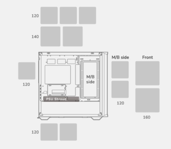 The cooling capability of 2x 160mm front panel fans defies the MX600 Mini RGB’s deceptively diminutive size. With a total capacity of 10 fans, even the most performance-intensive rig stays cool at peak operation.