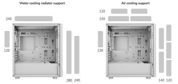- Supports choice of 280mm (max) water cooling or 160mm (max) air cooling