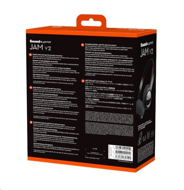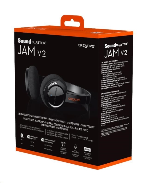 Vaše oblíbená přenosná Bluetooth sluchátka na uši jsou zpět – se stejným designem lehkým jako pírko a vysoce kvalitními neodymovými měniči! Produkt Sound Blaster JAM V2 je nyní vybaven technologií Bluetooth 5.0. Společně s rozšířenými zvukovými kodeky aptX™ HD a aptX™ Low Latency poskytuje nejlepší bezdrátový poslech. Užijte si bohatý a dechberoucí zvuk. Funkce Multipoint umožňuje zřetelně přepínat mezi dvěma různými zdrojovými zařízeními Bluetooth, aniž byste vyšli z rytmu.