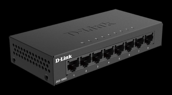 D-Link DGS-108GL je 8-portový Gigabit Ethernet neřízený stolní přepínač v pevném kovovém pouzdře, které zajišťuje jeho dlouhou životnost. Switch nabízí 8 Gigabit LAN portů 10/100/1000M RJ-45 pro vysokorychlostní kabelové připojení. Instalace je velmi snadná, jedná se o zařízení typu plug-and-play bez nutnosti konfigurace. DGS-108GL je cenově efektivním a spolehlivým řešením pro domácnosti, kanceláře (SOHO) a pro malé a střední firmy (SMB).