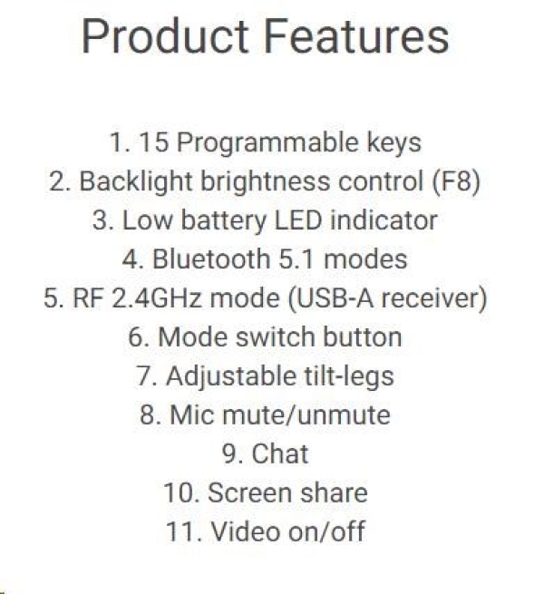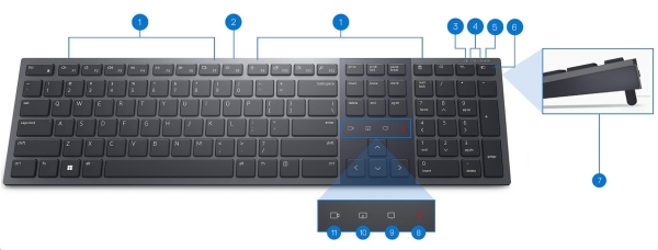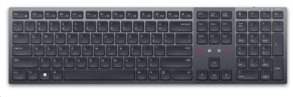 Jde o první nabíjecí klávesnici s certifikací Zoom na světě, vytvořenou s cílem transformovat spolupráci, zvýšit produktivitu a zajistit pohodlí po celý den. Technické údaje Typ zařízení: Klávesnice Podsvícení: Ano Rozhraní: 2.4 GHz, Bluetooth 5.1 Bezdrátový přijímač: Bezdrátový přijímač USB Typ: Bezdrátový Funkce horkých kláves: Multimédia, programovatelný, kalkulačka, hra/přestávka, ovládání podsvětlení, snímek obrazovky, rolovací zámek, Zoom touch controls Lokalizace a rozložení: QWERTZ česká/slovenská Vlastnosti: Číselná klávesnice Šířka: 43.97 cm Hloubka: 12.16 cm Výška: 2.07 cm Váha: 728 g Barva: Grafit Dodávané příslušenství: Kabel USB-C na USB-C Odpovídající standardům: AES-128, certifikace Zoom Obsažený software: Dell Peripheral Manager (pouze Windows) Požadovaný operační systém: Apple MacOS, Linux, Android, Google Chrome OS, Red Hat Enterprise Linux 8.0, Ubuntu 18.04, Microsoft Windows 7 / 8.1 / 10 / 11 Typ baterie: Dobijecí Provozní doba (až): 20 dnů