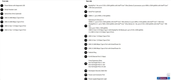 •HDMI 2.1, up to 5120 x 3200 @60Hz with IntelCore™ Ultra (Series 2); up to 4096 x 2160 @60Hz with IntelCore™ (14th Gen) •DisplayPort 2.1, up to 7680 x 4320 @60Hz with IntelCore™ Ultra (Series 2); 1.4a, up to 5120 x 3200 @60Hz with IntelCore™ 14th Gen •VGA, up to 1920 x 1200 @60Hz •USB 3.2 Gen 2 (10 Gbps) Type-C with DisplayPort Alt Mode port, up to 5120 x 3200 @60Hz •2 x USB 3.2 Gen 2 (10 Gbps) Type-A Ports