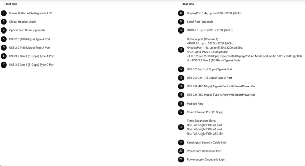 •HDMI 2.1, up to 5120 x 3200 @60Hz •DisplayPort 1.4a, up to 5120 x 3200 @60Hz •VGA, up to 1920 x 1200 @60Hz •USB 3.2 Gen 2 (10 Gbps) Type-C with DisplayPort Alt Mode port, up to 5120 x 3200 @60Hz •2 x USB 3.2 Gen 2 (10 Gbps) Type-A Ports