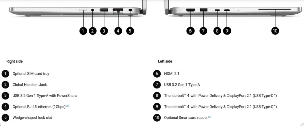 Model je vybaven porty USB-C s podporou Power Delivery a DisplayPort, klasickými USB-A porty, HDMI 2.1 a RJ-45 Ethernetem pro připojení periferií a externích monitorů. Integrovaná FHD HDR + IR kamera s mikrofonem umožňuje kvalitní videohovory a díky podsvícené klávesnici je pohodlné psaní i ve slabém světle. Bezdrátová konektivita zahrnuje Wi-Fi 6E a Bluetooth pro flexibilní propojení s dalšími zařízeními.