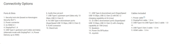 UltraSharp 38 Curved USB-C Hub Monitor – U3824DW TECHNICAL SPECIFICATION: DIAGONAL VIEWING SIZE: 952.90 mm (37.52 inches) PRESET DISPLAY AREA (H X V): 879.67 mm x 366.53 mm (34.63” x 14.43”) PANEL TYPE: IPS Black Technology DISPLAY SCREEN COATING: Anti-Glare with 3H hardness MAXIMUM PRESET RESOLUTION: 3840 x 1600 at 60 Hz VIEWING ANGLE: 178° vertical / 178° horizontal PIXEL PITCH: 0.22908 mm x 0.22908 mm PIXEL PER INCH (PPI): 110.87 CONTRAST RATIO: 2000 to 1 (typical) ASPECT RATIO: 21:9 BACKLIGHT TECHNOLOGY: White LED Edgelight System BRIGHTNESS: 300 cd/m2 (typical) TCO Certified: Yes COLOR GAMUT: • DCI-P3 98% • Display P3 98% • sRGB 100% • REC. 709 100% • 1.07 billion colors RESPONSE TIME: 8 ms (Normal), 5 ms (Fast) HDR READY: No CONNECTIVITY: • 1 x DP 1.4 (HDCP2.2) (supports up to WQHD+ 3840 x 1600 60 Hz) • 2 x HDMI port (HDCP2.2) (supports up to WQHD+ 3840 x 1600 60 Hz TMDS as per specified in HDMI 2.1) • 1 x USB Type-C upstream port (video and data) (Alternate mode with DisplayPort 1.4, Power Delivery up to 90W) • 1 x USB-C upstream port (data only, 10 Gbps USB 3.2 Gen2) • 4 x Super speed USB 10 Gbps (USB 3.2 Gen2) Type-A downstream port • 2 x Super speed USB 10 Gbps (USB 3.2 Gen2) Type-C downstream port with charging capability at 15W (maximum) • 1 x Super speed USB 10 Gbps (USB 3.2 Gen2) Type-A with BC1.2 charging capability at 2 A (maximum) • 1 x Audio line-out port • 1 x RJ45 2.5G port ADJUSTABILITY: Height adjustable (120 mm), Tilt (-5° to 21°), Swivel (-30° to 30°), Slant adjust (-4° to 4°) PBP/PIP: PbP (Yes), PiP (Yes) KEYBOARD, VIDEO AND MOUSE (KVM): Yes, KVM and Auto-KVM DAISY CHAIN AVAILABILITY: No AUDIO OUTPUT: 1 x Audio line-out BUILT-IN SPEAKER: 2 x 9W DELL DISPLAY MANAGER: Yes, Easy Arrange, Other key features SPECIFICATIONS - SERVICE / SUPPORT DETAILS: 3-Year Advanced Exchange Service and Premium Panel Exchange HEIGHT WITH STAND (COMPRESSED ~ EXTENDED): 443.76 mm ~ 563.76 mm (17.47” ~ 22.20”) WIDTH WITH STAND: 894.26 mm (35.21”) DEPTH WITH STAND: 251.21 mm (9.89”) HEIGHT WITHOUT STAND: 392.33 mm (15.44”) WIDTH WITHOUT STAND: 894.26 mm (35.21”) DEPTH WITHOUT STAND: 102.35 mm (4.03”) WEIGHT (PANEL ONLY - FOR VESA MOUNT): 8.79 kg (19.37 lb) WEIGHT (WITH STAND ASSEMBLY AND CABLES): 13.27 kg (29.25 lb) WEIGHT (WITH PACKAGING): 18.98 kg (41.83 lb) SECURITY: Security lock slot2 (cable lock sold separately) Anti-theft stand lock slot (to lock stand to monitor using screw) COMPLIANT STANDARDS: ENERGY STAR® certified monitor EPEAT® registered where applicable. EPEAT registration varies by country RoHS-compliant TCO Certified & TCO Certified Edge BFR/PVC free monitor (excluding external cables) Arsenic-free glass and Mercury-free for the panel only FLAT PANEL MOUNT INTERFACEVESA mounting holes (100 mm x 100 mm - behind attached VESA Cover) FWHAT’S INCLUDED: Monitor, Stand Riser, Stand Base 1x Power cable1 x DP Cable (DP to DP) - 1.8 m 1x HDMI cable (HDMI-HDMI) - 1.8 m 1x Type-C Gen 2 (C-C cable) - 1 m 1x USB-A to USB-C Gen 2 cable - 1 m Quick setup guide Safety, Environmental and Regulatory Information Factory calibration report Odkaz na stránky výrobce: https://www.dell.com/en-us/shop/dell-ultrasharp-38-curved-usb-c-hub-monitor-u3824dw/apd/210-bhsm/monitors-monitor-accessories