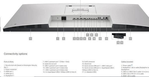 Dell UltraSharp 43 4K USB-C Hub Monitor - U4323QE 107,95 cm (42.51'') Znásobte svou produktivitu s tímto 42,5'' monitorem s konektivitou pro více počítačů, 4 unikátními oddíly FHD přes iMST, ComfortView Plus a kabelový Ethernet. Displej * Viditelná úhlopříčka: 107,95 cm / 42.51 palce * Přednastavená obrazová plocha (vodorovně × svisle): 941.184 mm x 529.416 mm 37.05'' × 20.84'' * Typ panelu: IPS Technology * Povrch displeje obrazovky: Antireflexní úprava (3H) * Rozhraní pro montáž plochého monitoru: Montážní otvory VESA (100 mm × 100 mm za připojeným krytem VESA) * Maximální přednastavené rozlišení: 3840 x 2160 při frekvenci 60 Hz * Pozorovací úhel: 178° svisle / 178° vodorovně * Rozteč pixelů: 0.2451 mm × 0.2451 mm * Pixely na palec (PPI): 103.6 * Kontrastní poměr: 1000:1 (obvykle) * Poměr stran: 16 : 9 * Podsvícení: LED * Jas: 350 cd/m2 (obvykle) * Doba odezvy: 8 ms v NORMÁLNÍM režimu, 5 ms v RYCHLÉM režimu Konektivita * 2 x DP 1.4 * 2x HDMI port version 2.1 (TMDS) * 1x USB-C (DP.14 HB3 (2lane)/ HBR2 (4 Lane), Power Delivery upto 90W, 2/4 lane switching), USB 3.2 Gen 2 10Gbps) upstream * 3x USB-C (USB 3.2 Gen2, 10Gbps KVM) Upstream port, Data Only * 3x super speed USB-A (USB 3.2 Gen2 10Gbps) downstream ports * 1x super speed USB A (USB 3.2 Gen2 10Gbps) with B.C 1.2 * 1x USB C (USB 3.2 Gen2 10 Gbps, Up to 15W charging) downstream Quick access port * 1x Analog 2.0 audio line out (3.5mm jack) * 1x RJ45 port (PXE boot, MAC address pass thru, WoL, 1Gbps) Quick Access port Rozměry * Výška: 595.20 mm ~ 655.20 mm * Šířka: 967.21 mm * Hloubka: 256.40 mm * Hmotnost: 18.55 kg * Hmotnost balení: 25.23 kg Napájení * Požadované napětí: 100 až 240 V stř. / 50 Hz nebo 60 Hz ± 3 Hz / 2,6 A (maximálně) * Spotřeba energie při běžném provozu: 52,1 W (režim zapnuto) * Spotřeba energie v pohotovostním/spánkovém režimu: 0,3 W Šasi * Naklápění: –5° až 21° * Nastavitelnost výšky: 1150 mm * Výška, otočení (rotace), natočení, náklon * Rozhraní pro montáž plochého monitoru: Montážní otvory VESA (100 mm × 100 mm za připojeným krytem VESA) Obsah balení * Monitor, stojan * 1x Napájecí kabel * 1x Type-C Gen 2 PD 3.0 (C-C cable) - 1 m * 1x DP Cable (DP to DP) - 1.8 m * 1x Type-C Gen 2 - 1.8 m (Type A to Type C) * 1x HDMI Premium High Speed (HDMI-HDMI) - 1.8 m * Průvodce rychlým nastavením * Bezpečnostní informace a předpisy a informace o vlivu na životní prostředí Záruka * Typ: Tříletá výměnná servisní služba Advanced Exchange Service se zárukou Premium Panel Guarantee * Služba Advanced Exchange Service * Tento monitor je dodáván s tříletou výměnnou servisní službou Advanced Exchange Service. V případě nutnosti vám během tříleté omezené záruky na hardware bude příští pracovní den zaslán náhradní monitor. Stránky výrobce https://www.dell.com/en-us/shop/dell-ultrasharp-43-4k-usb-c-hub-monitor-u4323qe/apd/210-bfpo/monitors-monitor-accessories
