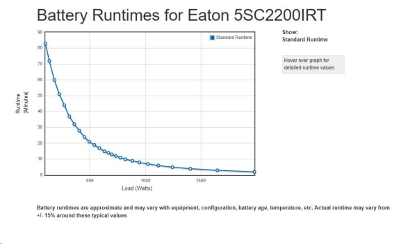 zatížení, úroveň nabití baterie a odhadovaná doba zálohy.
