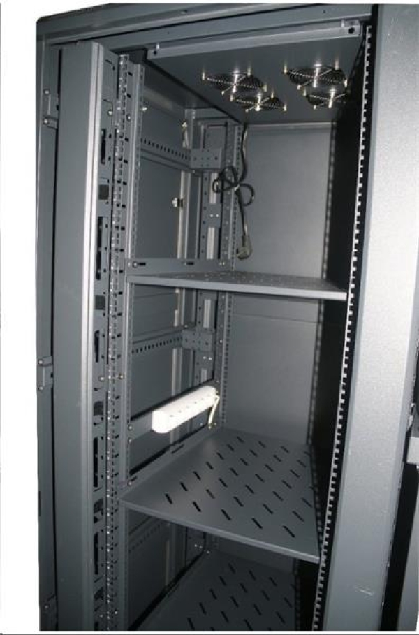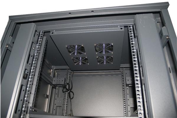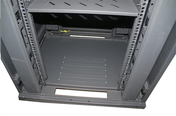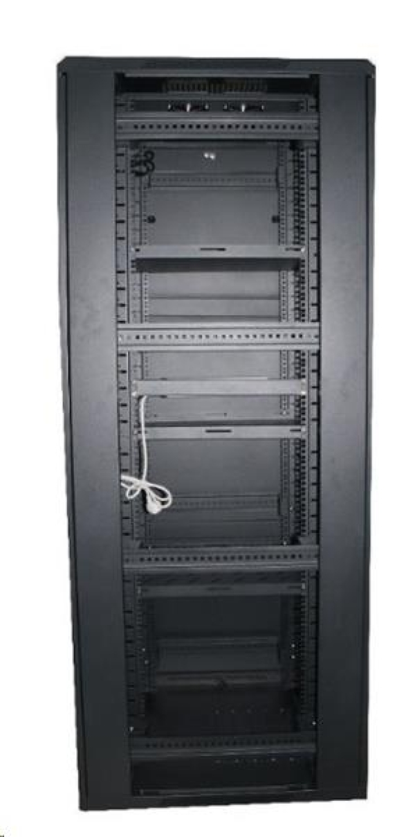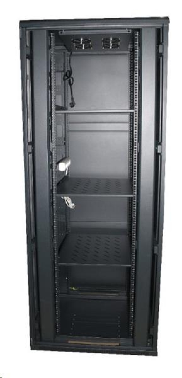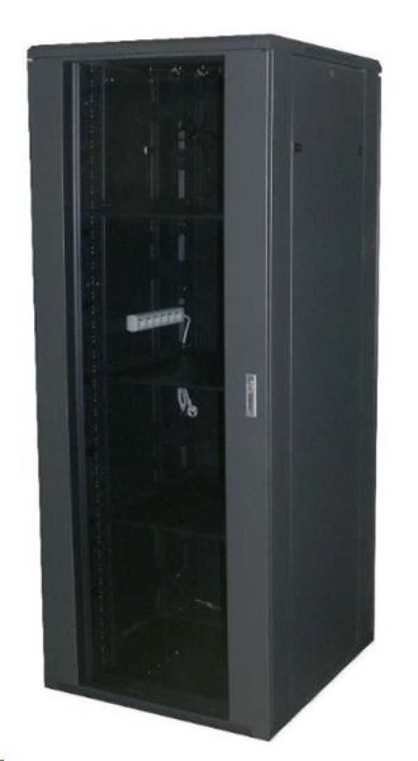 Rozvaděč je standardně vybaven: – výškově stavitelnými nožičkami – pojezdovými kolečky – výškově přestavitelnými policemi (3ks pro 42U, 2ks pro 32U, 1ks pro 22U) – ventilační jednotkou se čtyřmi ventilátory – čtyři kusy svislých lišt pro kabeláž (modely o šířce 800mm) – sadou spojovacího materiálu. 20 setů šroubů a matek pro výšku 22U, 40 setů pro vyšší – panelem se 6 zásuvkami 230V – barva: černá Statické zatížení je 800kg. Sklo dvířek z tvrzeného skla. Odnímatelné boční kryty. Dodáváno v rozloženém stavu ve 2 krabicích.